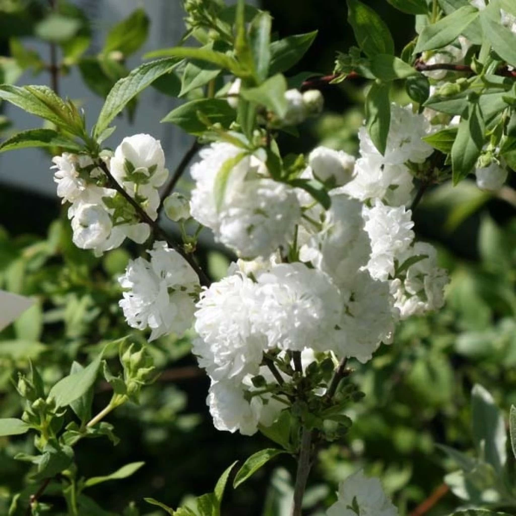 Prunus glandulosa alba plena, parfois qualifié de « glandeur » par des jardiniers facétieux pour sa floraison tardive en mai, est un arbuste de port compact, environ 1,5m, de port arrondi, à la remarquable floraison couleur blanc pur.