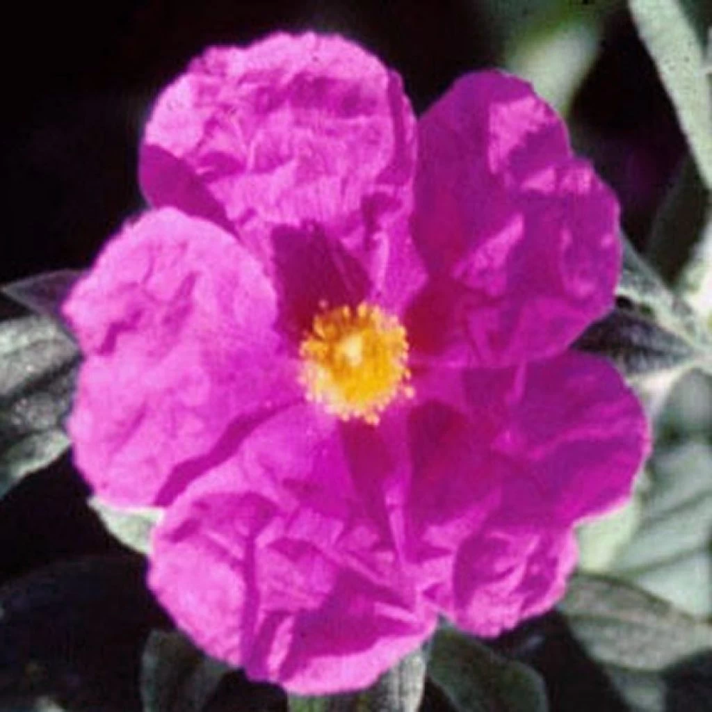 Le Cistus (x) pulverulentus ‘Sunset’ appartient à la famille des cistacées. Il est issu du croisement entre le Cistus albidus, au feuillage de velours gris, très tolérant vis à vis du calcaire, et le Cistus crispus, doté d’un port très tapissant. Toutes ces plantes sont originaires des régions méditerranéennes. Le Cistus pulverulentus Sunset est donc un arbuste ramifié quil atteindra 40 à 60 cm de hauteur, pour une envergure de 1.25 à 2 m, voire bien davantage sur les sujets âgés. Sa croissance est assez lente, la plante vieillit relativement bien et disparaît au bout de 12 à 15 ans, quelquefois davantage. La floraison a lieu au printemps ou en début d’été selon le climat, après celle des autres cistes, et dure deux mois environ, se prolongeant jusqu’en été. Les fleurs, en corolles rondes bien ouvertes, de 4 à 5 cm de diamètre, sont d’un rose très vif, presque fluorescent, rehaussées au cœur par de nombreuses étamines jaune vif. Les pétales se chevauchent légèrement. Elles vivent à peine une journée, couvrant le sol de leurs pétales en fin d’après-midi, mais seront déjà remplacées le lendemain matin. Le feuillage, persistant, est composé de feuilles épaisses, allongées et gaufrées, ovales, irrégulièrement ondulées, gris-vert, pubescentes, mesurant de 3 à 5 cm de long. Les feuilles peuvent être partiellement caduques en fin d’été, en cas de sécheresse prolongée.