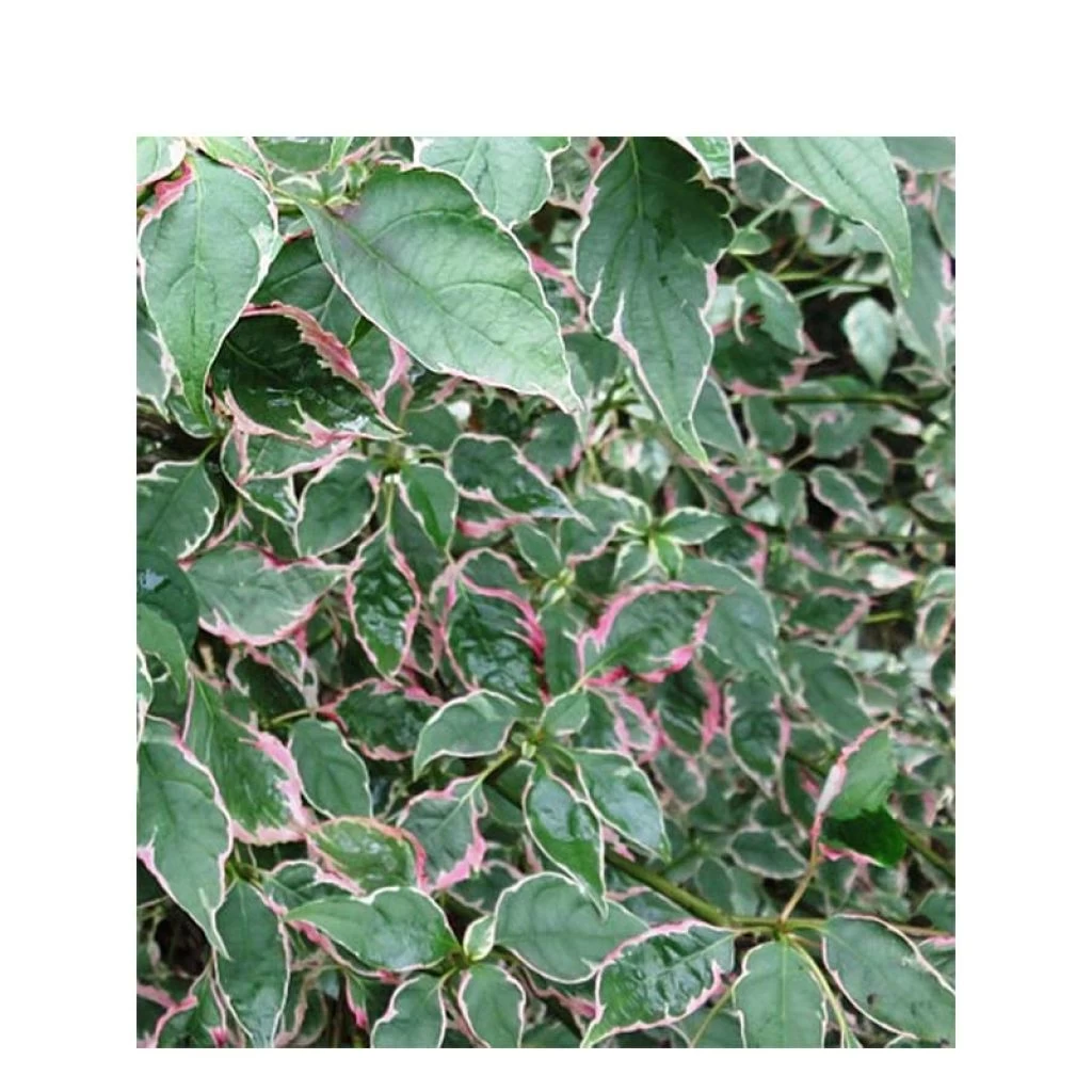 Cornus alternifolia ‘Pinky Spots’ ‘Minpinky’ est une très belle variété de cornouiller des Pagodes sélectionnée pour la beauté de son feuillage panaché et sa bonne vigueur. Il forme rapidement un arbuste au port gracieux mais bien touffu dès la base, avec des rameaux rouges étagés et horizontaux, et s’habille d’un très beau feuillage tricolore au printemps, prenant au fil des saisons des teintes fantastiques. Sa floraison estivale mellifère laisse place à des baies pourprées qui font le régal des oiseaux. Offrez-lui une place de choix en isolé dans un petit jardin ou à l’avant d’un grand massif arbustif !