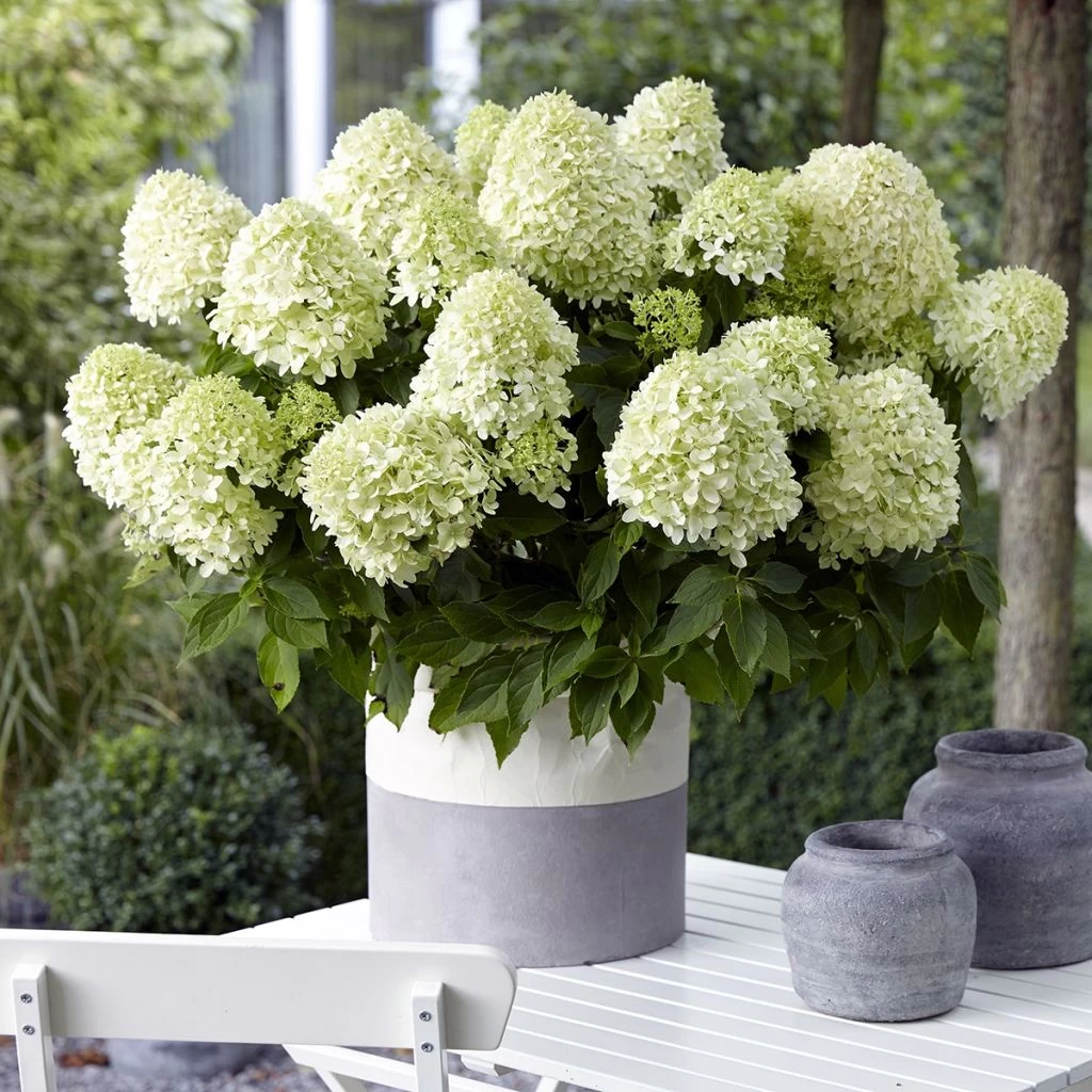 L’Hydrangea paniculata ‘Little Spooky’ est un hortensia paniculé nain particulièrement compact et florifère, parfaitement adaptée aux petits jardins et à la culture en pot. Ce qui n’empêche pas ce petit arbuste d’offrir une floraison décorative et de longue durée. Bien trapu, doté de tiges très solides, il porte sans faiblir de grosses panicules de fleurs denses et arrondies passant du blanc au vert pâle.