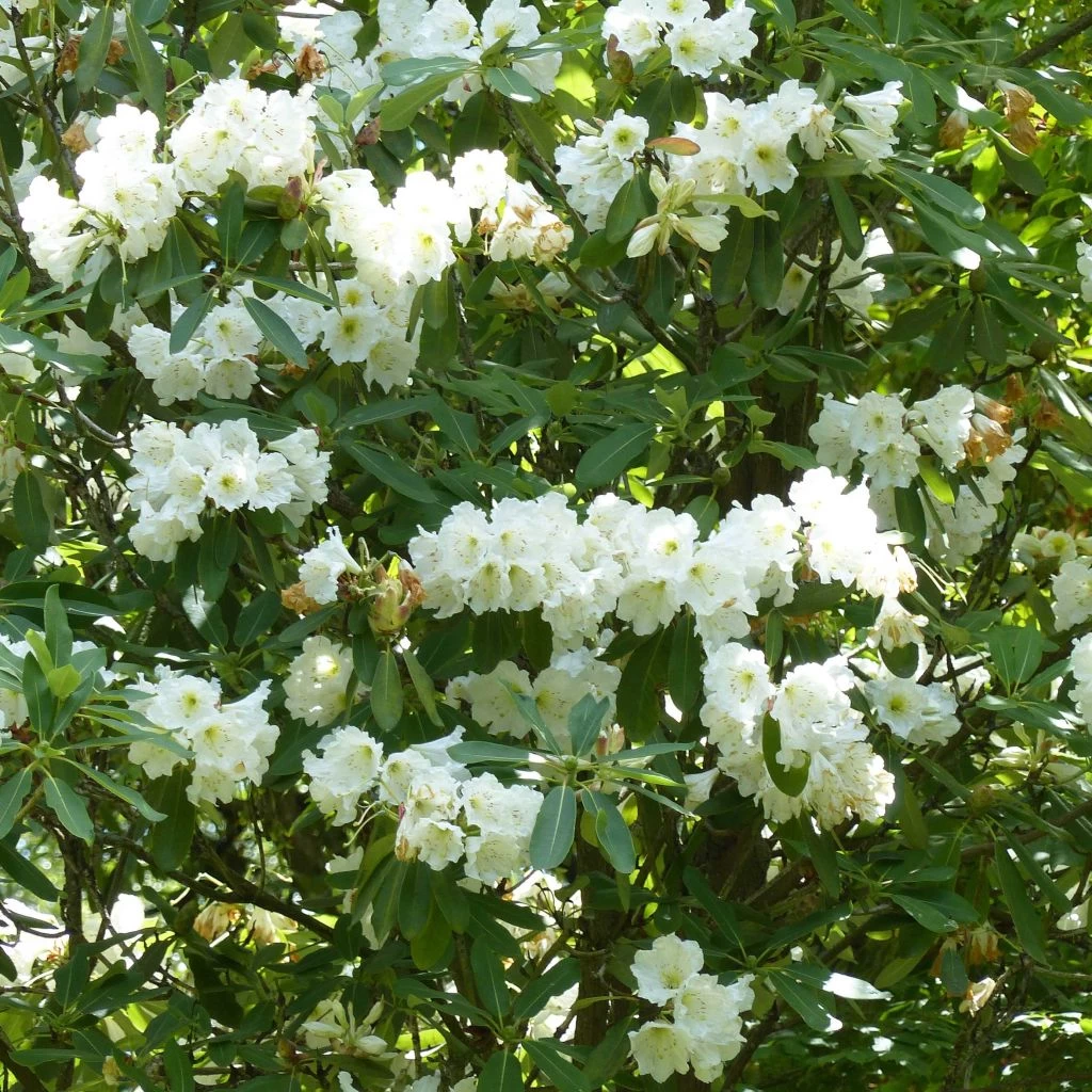 Le Rhododendron ‘Polar Bear’ est un hybride entre un R. auriculatum et R. diapretes, variété obtenue par John Barr Stevenson en 1926. Le résultat est une plante extrêmement vigoureuse et splendide (caractères transmis par auriculatum) et qui fleurit tardivement (typique de diapetres). Contrairement à la majorité des rhododendrons, cette grande variété est une star estivale avec sa floraison tardive aussi magnifique que parfumée. Ses inflorescences apparaissent en juillet aout, en corymbes de grandes fleurs blanches tubulaires. Ce cultivar très grand peut atteindre 5 m de hauteur, voire davantage s’il se satisfait de son emplacement. Il se développera d’autant en largeur ! L’arbuste au port ample présente des jeunes pousses d’une teinte bleutée et des grandes feuilles persistantes d’une couleur vert émeraude.