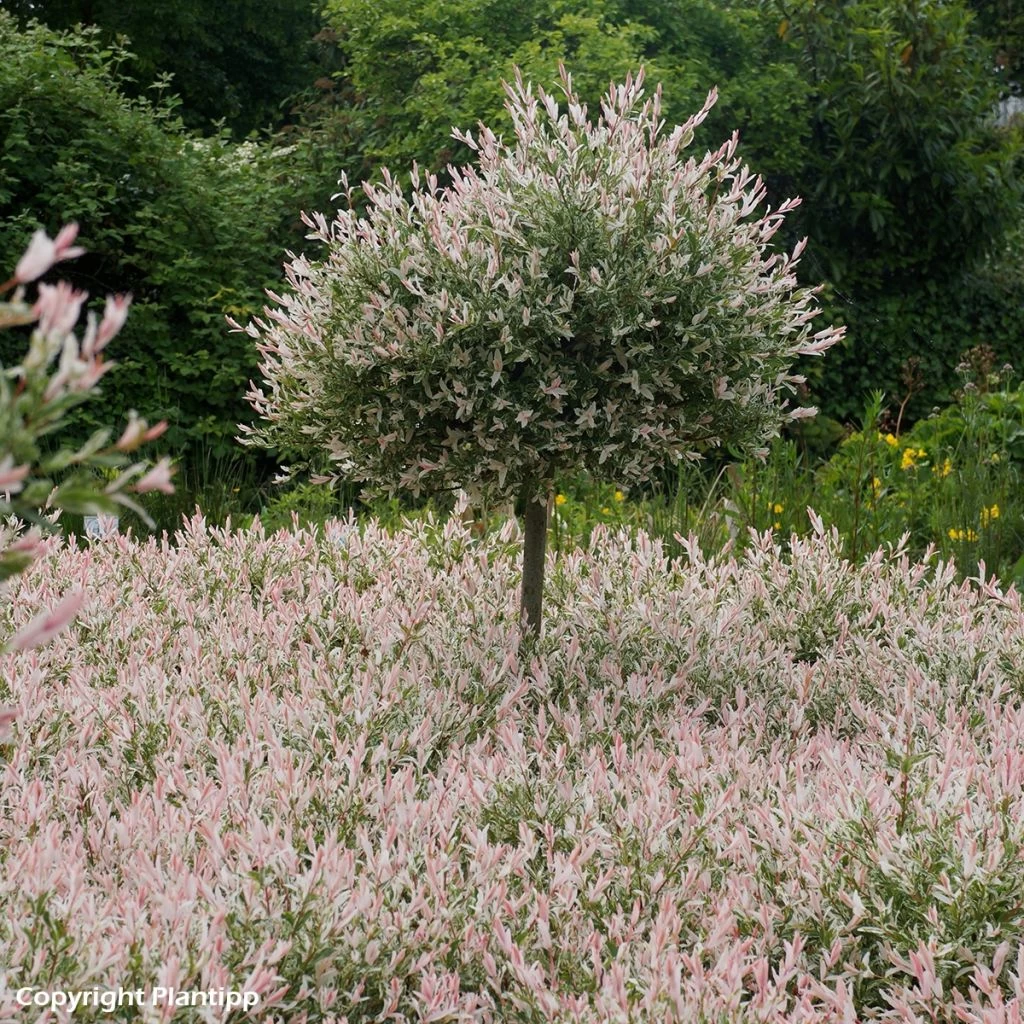 Le Salix integra ‘Flamingo’ est une variété de saule crevette ressemblant à la variété ‘Hakuro Nishiki’, mais avec un attrait supplémentaire : ses pousses à jeune bois rouge, décoratives en hiver après la chute des feuilles. Celles-ci présentent le même mélange de couleur, vert, blanc et surtout rose, qui vaut à ces saules leur appellation de crevette. Ce petit arbuste forme une boule de couleurs explosant en tous sens avec ses rameaux graciles qui se laissent bercer par le vent. Parfaitement rustique, il se cultive sans difficulté en pleine terre ou en bac sur la terrasse. Sa seule exigence est un sol fertile qui reste frais, voire humide.